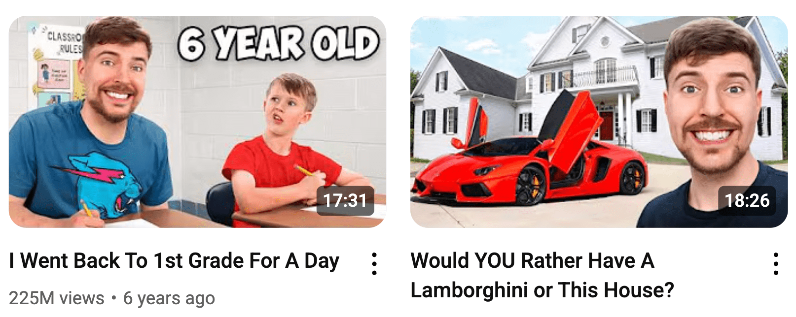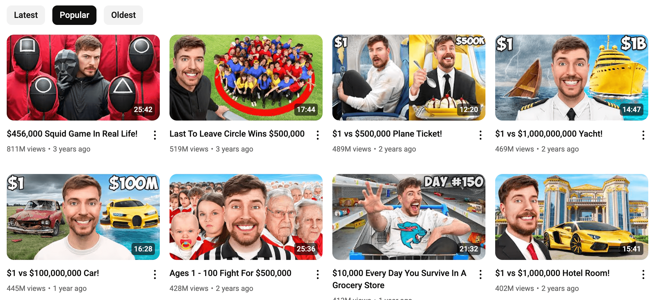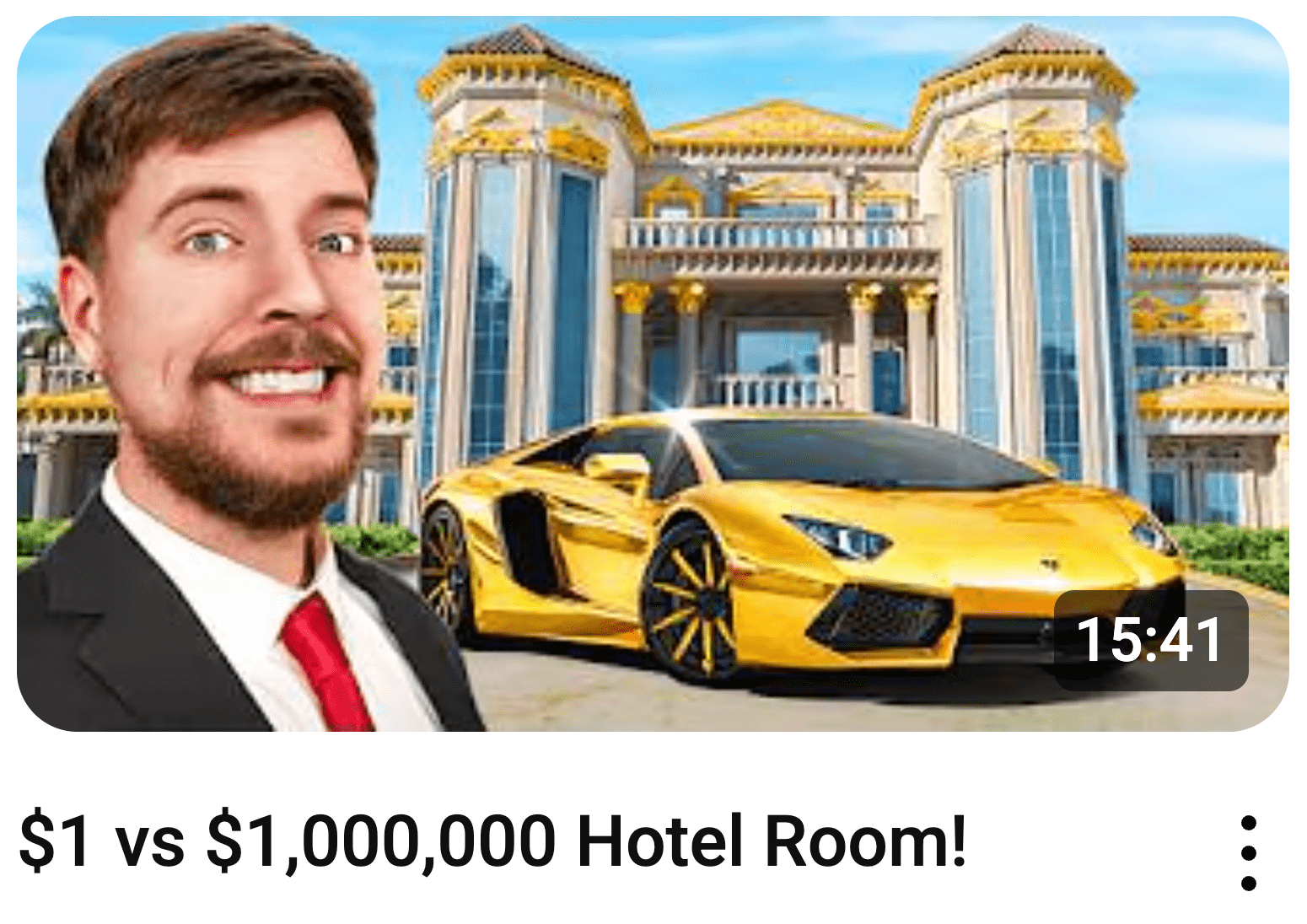 Look at his "$1 vs $1,000,000 Hotel Room" thumbnail. You see expensive stuff on one side, cheap stuff on the other. Done. Your brain gets it instantly.