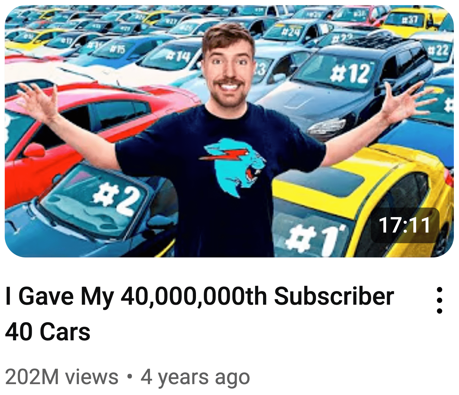 Take his "I Gave My 40,000,000th Subscriber 40 Cars" thumbnail. You see cars, you see celebration, but you don't see the actual moment of giving. That gap between what you see and what you want to know? That's the click.