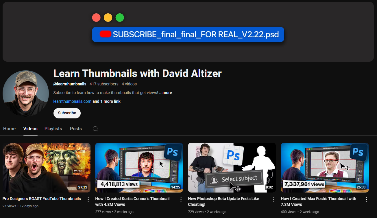 You don’t need a design degree or a decade of Photoshop experience to succeed in the YouTube thumbnail world. What you do need is a strong understanding of storytelling, composition, and how YouTube works, and David Altizer is a clear example of that.