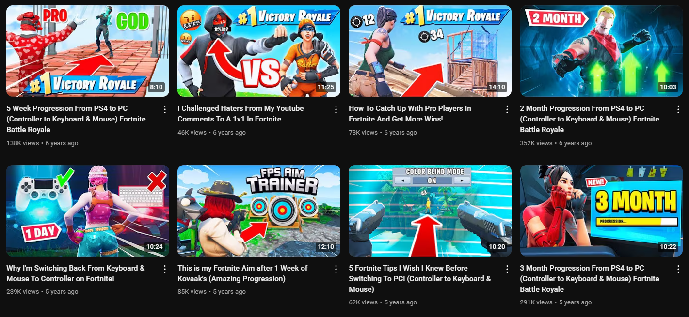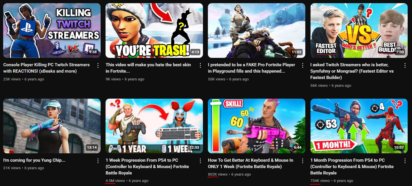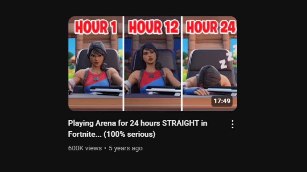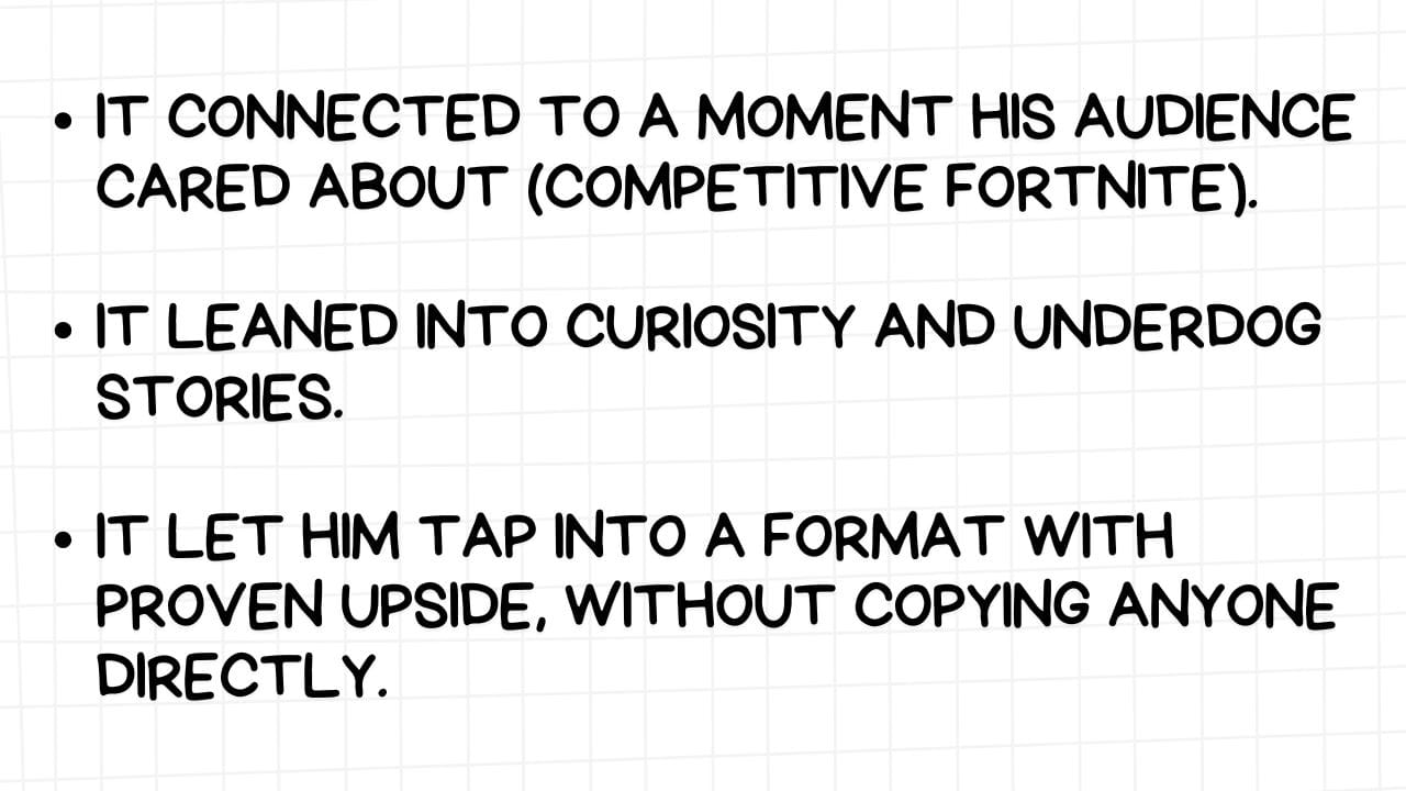 He borrowed ideas from other niches, like “8 hours straight” challenges and translated them into the Fortnite space. One of his biggest hits came from applying a trending structure to his niche.