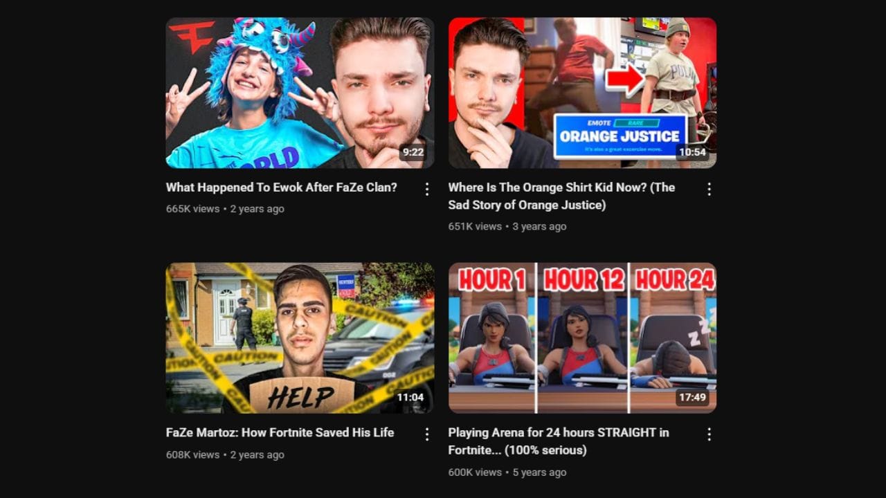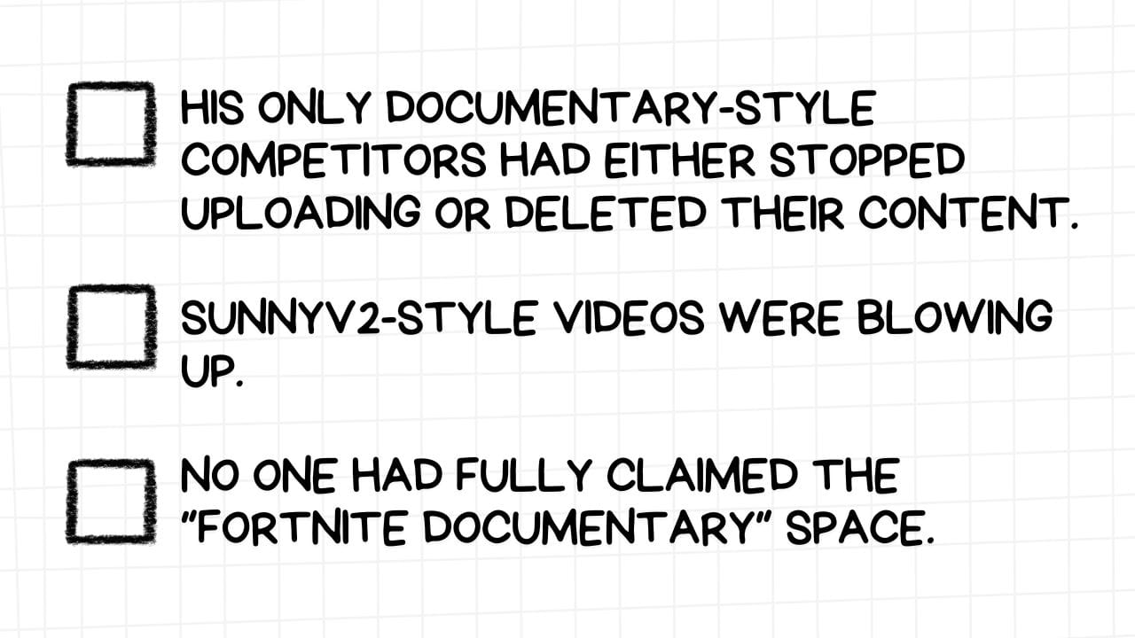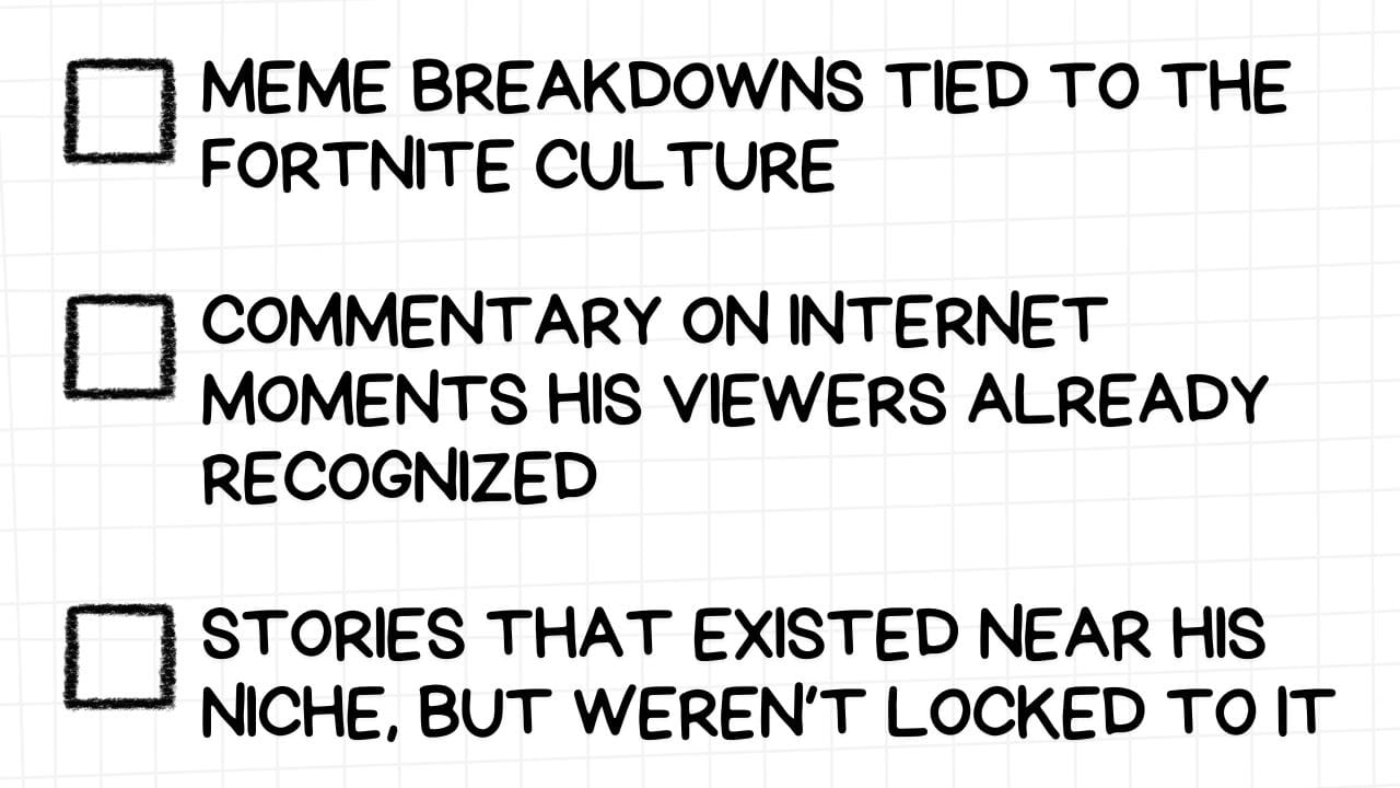 From that point on, he kept refining the format and made more Fortnite-focused documentaries. He then expanded slightly to adjacent games, meme topics and eventually broader content.