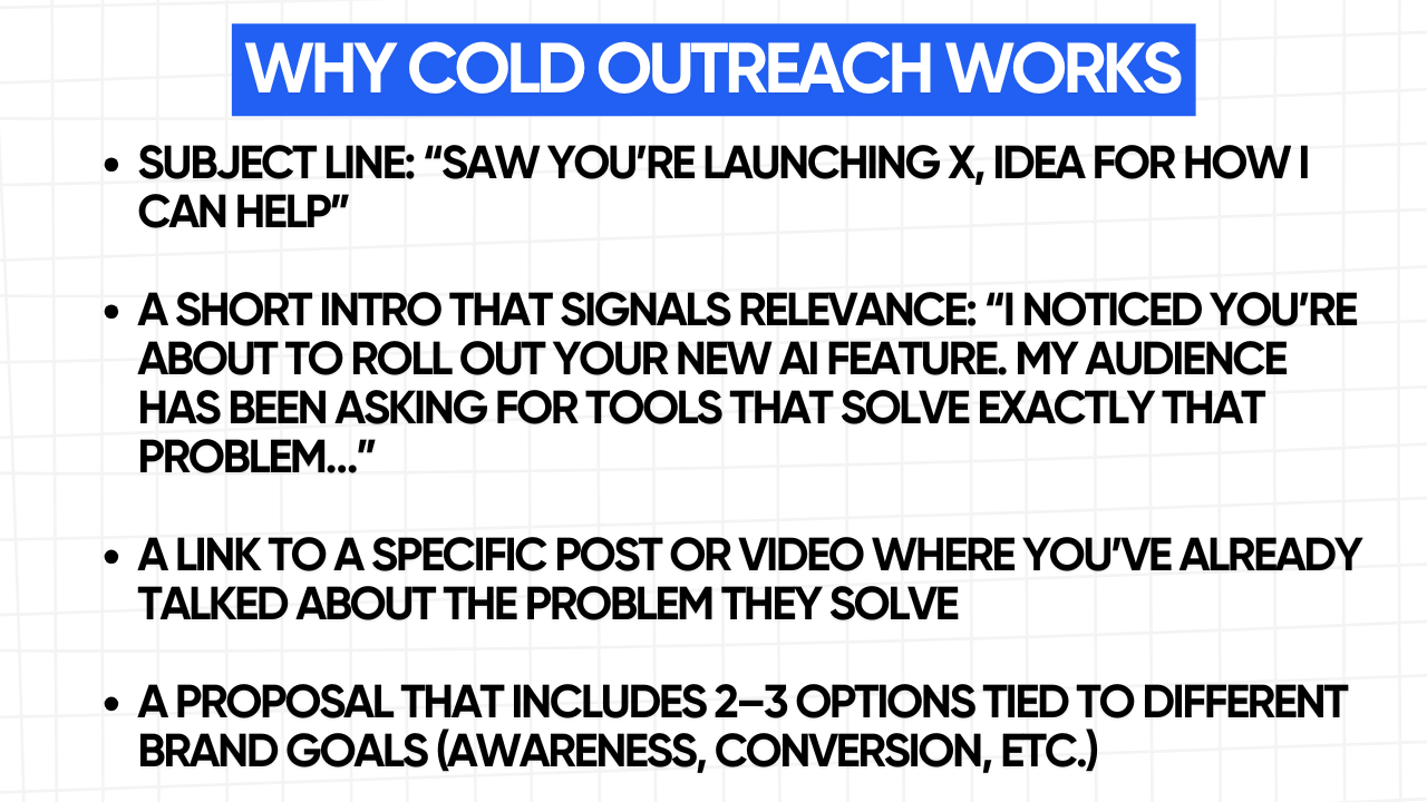 The best cold pitches aren’t just “Hey, I’d love to work with you.” They’re research-driven. They show you understand what the brand is up to, and they connect that to your audience in a meaningful way.