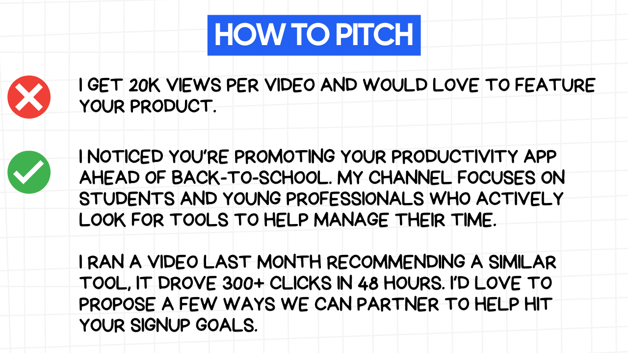 A common mistake creators make is pitching from their perspective: “I have 50K subscribers,” “My audience loves me,” “I get 10K views per video.” While all of that sounds good to you, it means very little to a brand unless you tie it directly to their goals.