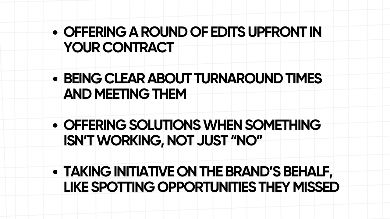 What makes creators stand out isn't just performance, it’s how they work. Being reliable, pleasant, responsive, and a bit flexible goes a long way. It doesn't mean saying yes to every demand, it means showing a willingness to solve problems together.