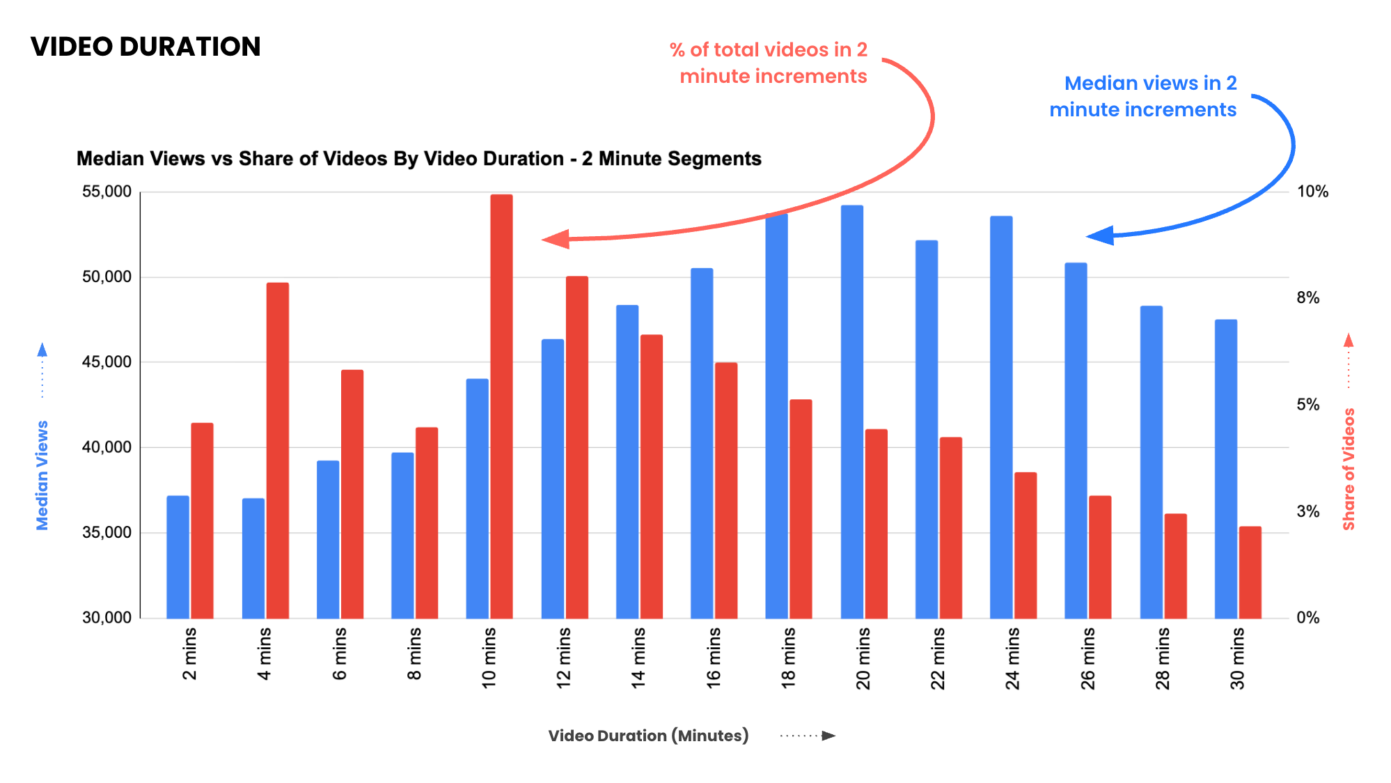 But when we plotted median views by video duration, a very different pattern emerged.