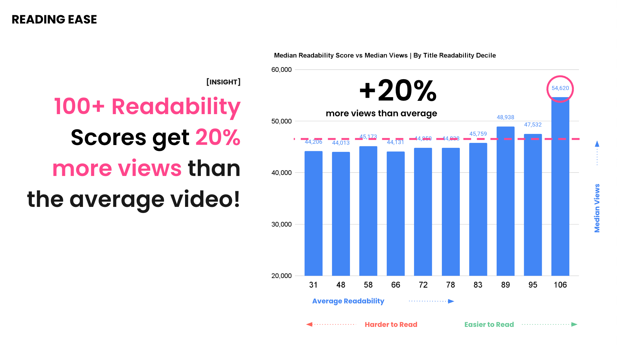 Titles with very high readability scores receive ~20% more views than the average video.