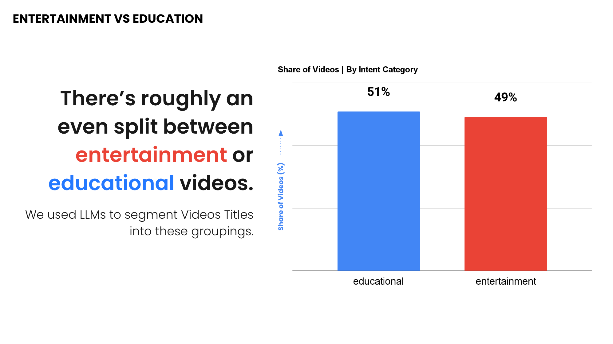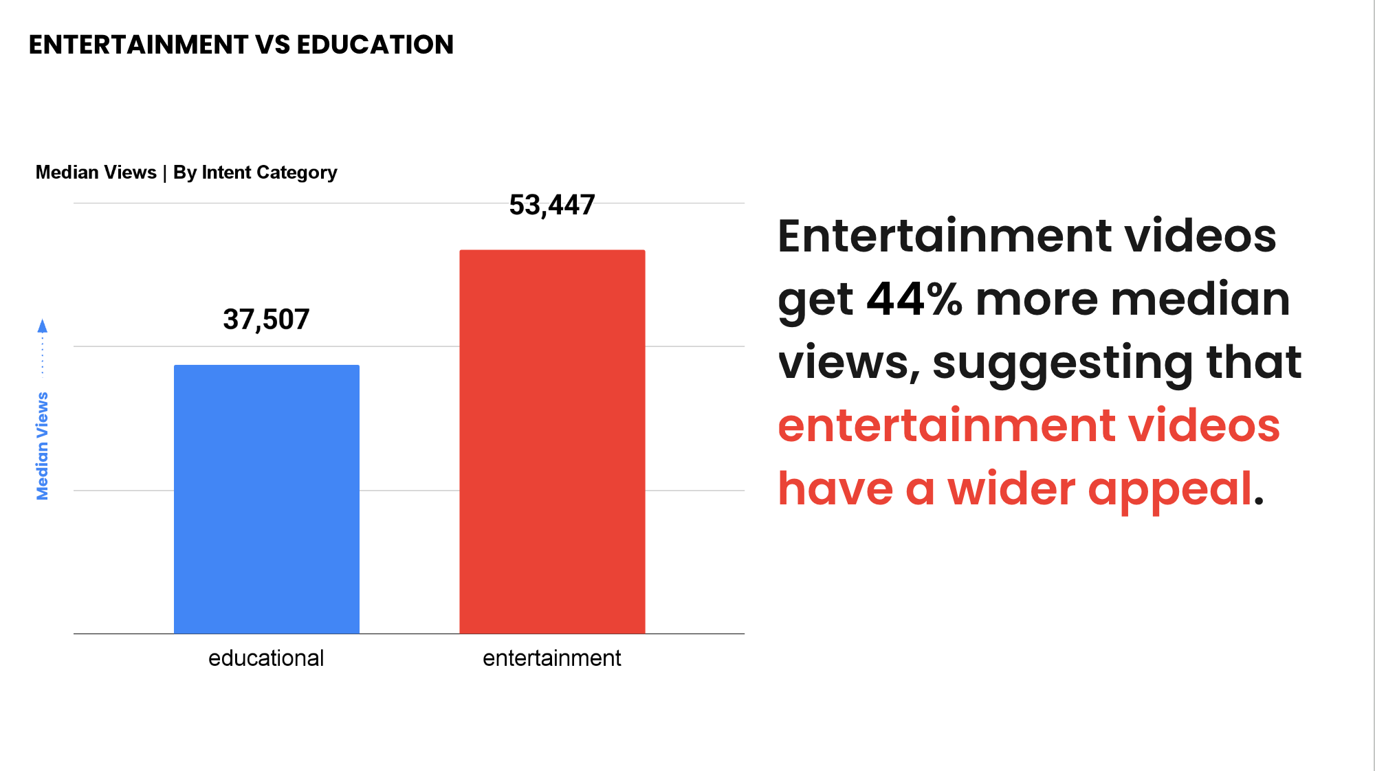 - Entertainment videos earn ~44% more median views