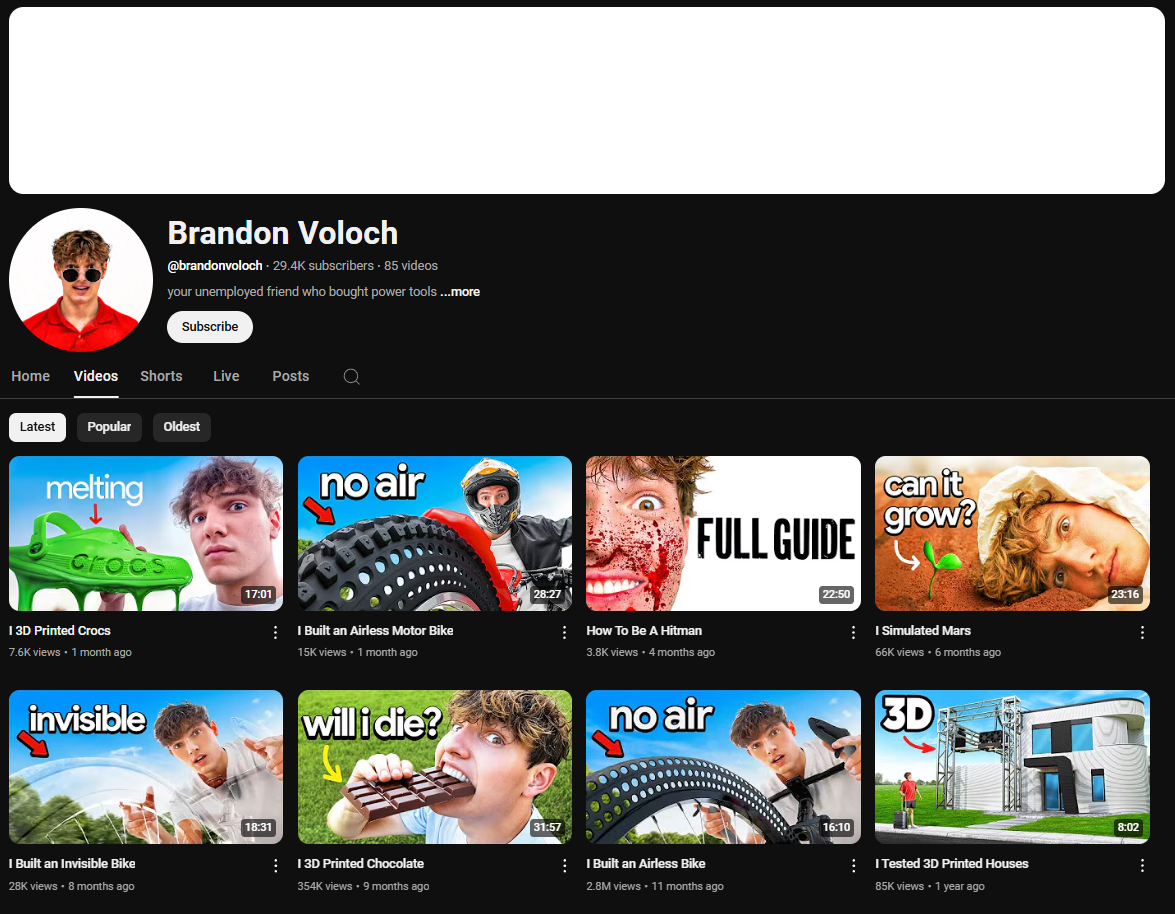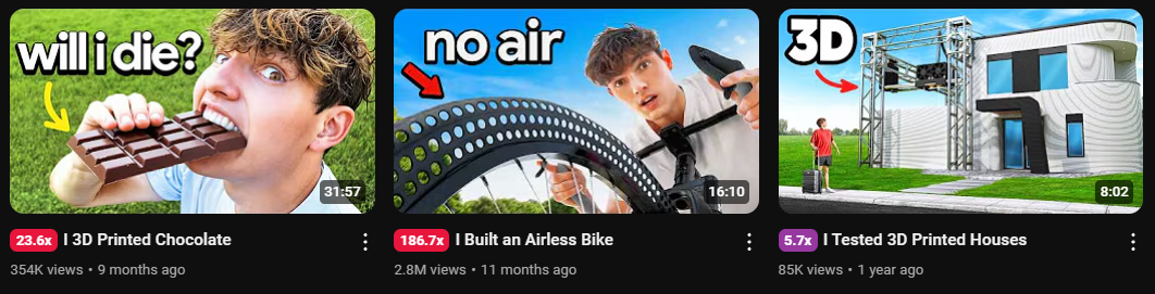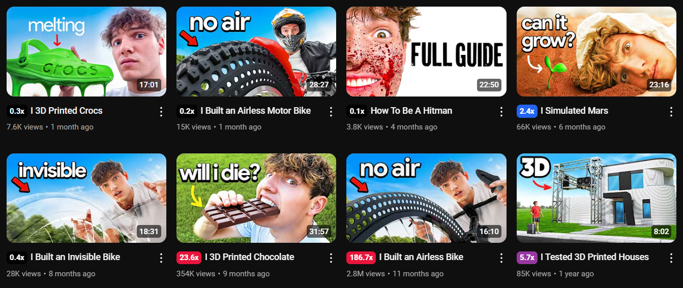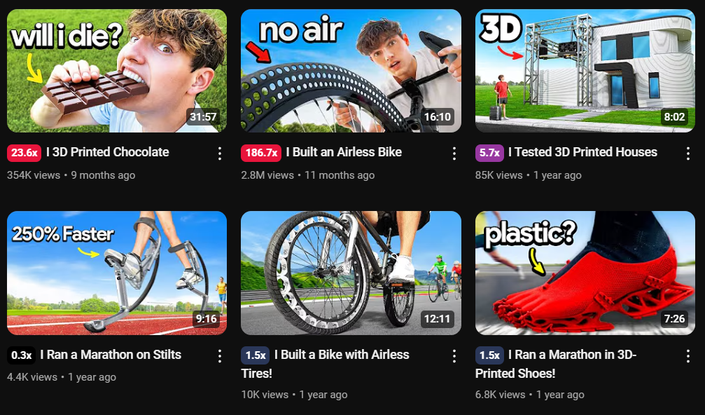 From there, he doubled down: more 3D-printed content, more builds, more weird-but-clickable challenges. He wasn’t just making things, he was narrowing into a specific lane of