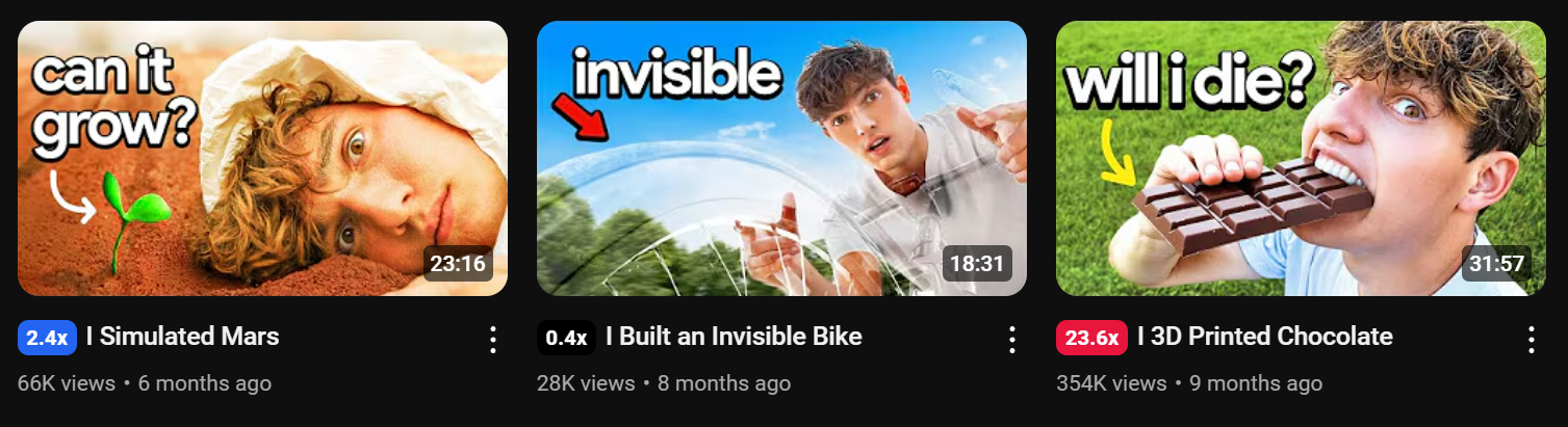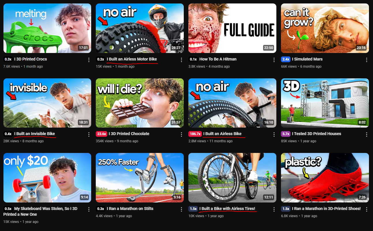 Think of it like a format-topic combo that already has built-in audience interest. It’s not just “I built something”, it’s “I built something 3D printed,” or “I built something invisible,” or “I tried a viral product and failed.”